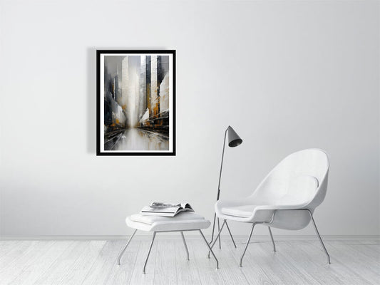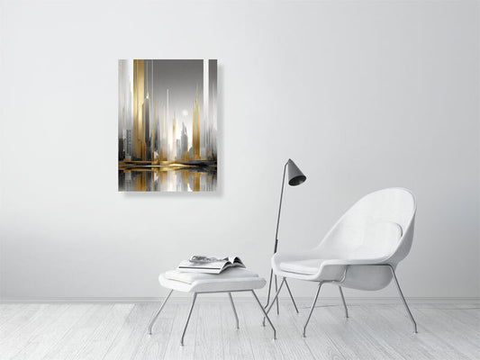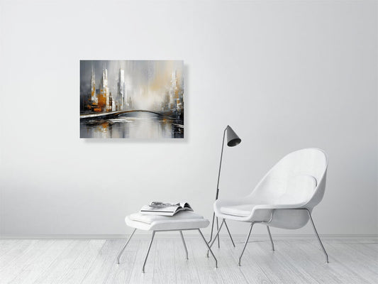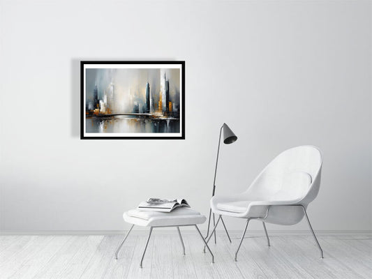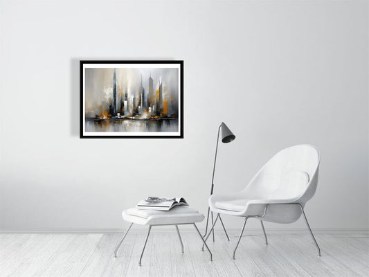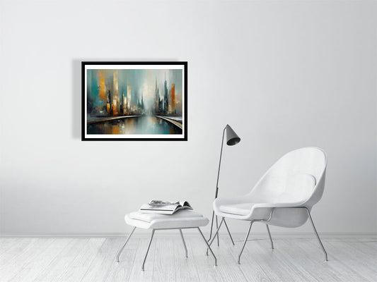The artwork is an abstract cityscape, vividly capturing the essence of an...